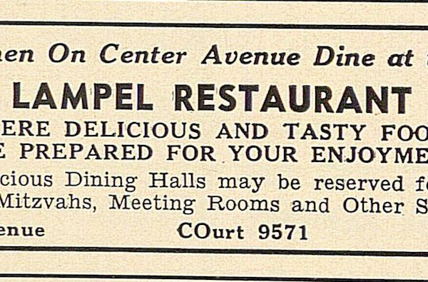 Advertisement for Lampel’s Restaurant at 1830 Center Ave. Notes “two spacious dining halls” for special occaisions.