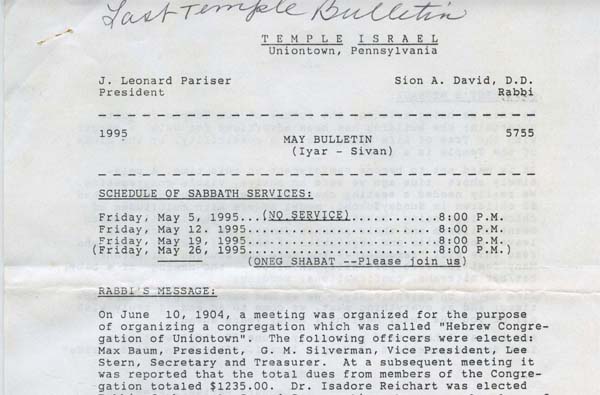In the last Temple Israel bulletin, Rabbi Sion David looked back to the beginning of the congregation, more than a century earlier.