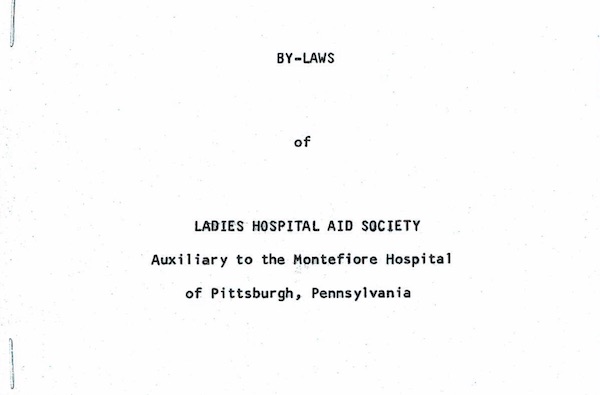 Bylaws of the Ladies Hospital Aid Society. English, 7 pages. Date 1967 Identifier MSS0032_B001_F005_I03_1967-bylaws Collection Ladies Hospital Aid Society Records [MSS 32] Source Rauh Jewish Archives at the Heinz History Center View Document