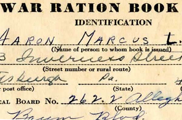 A war rations booklet belonging to Marcus Lester Aaron during World War II.