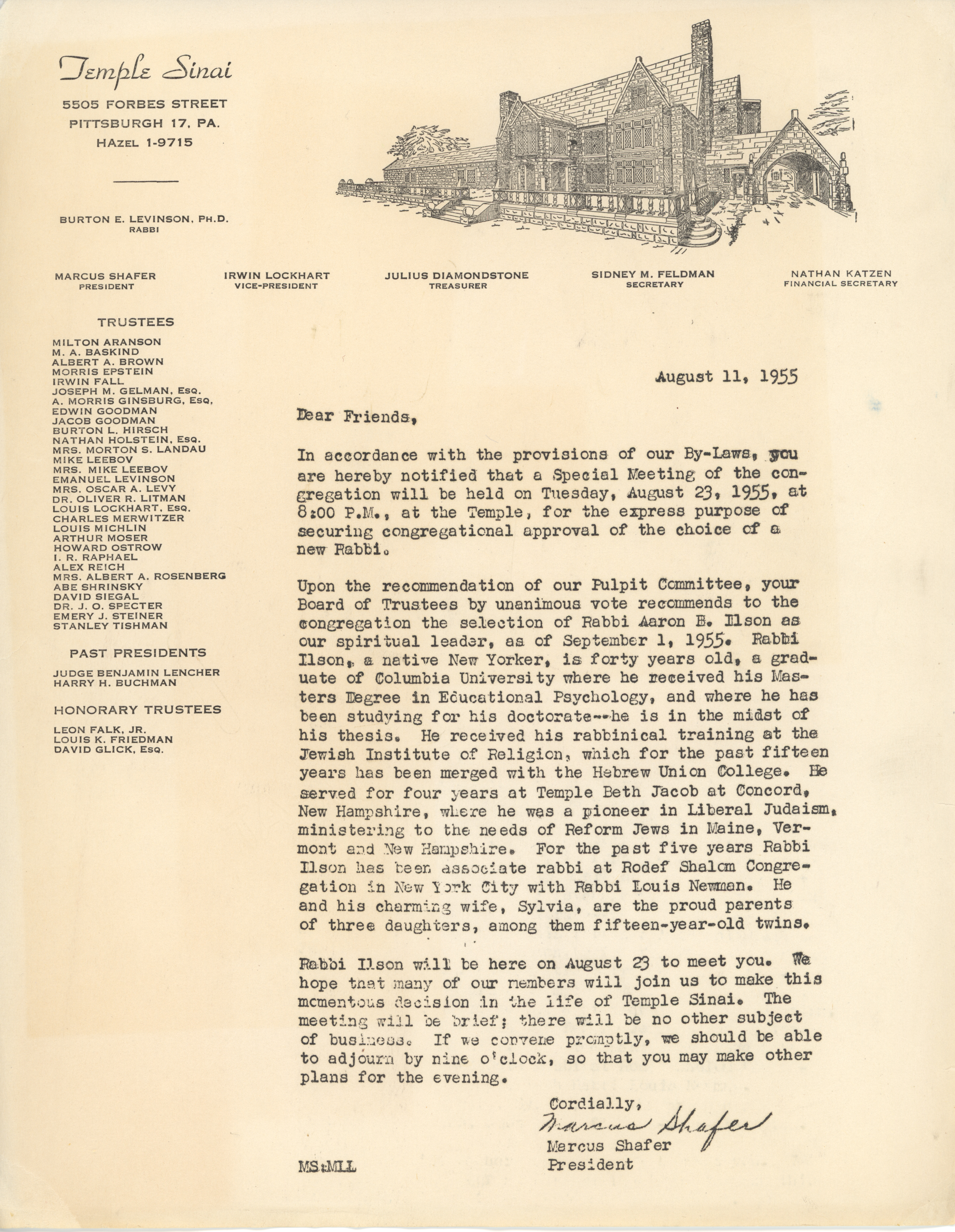 Letter from Marcus Shaffer, president of Temple Sinai, to congregants inviting them to a special meeting wherein a new rabbi will be chosen. The pulpit committee recommends Rabbi Aaron Ilson.