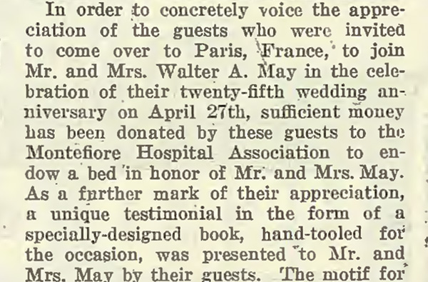 The 63 guests who attended the silver anniversary of Walter and Mollie May in Paris endowed a bed at Montefiore Hospital in honor of their hosts and commissioned a “unique testimonial” book.