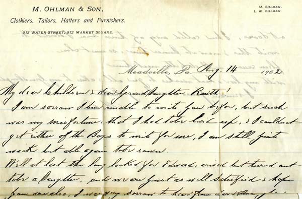 Melius Ohlman wrote a letter of congratulations to his daughter and son-in-law after the birth of their first child.