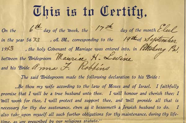 Morris Levine and Anna Robbins were married by the cantor Rev. Julius Bloom of B’nai Israel Congregation. Date September 19, 1913 Identifier 20050227_F001_marriagecertificate.pdf Collection Morris Levine Collection Source Rauh Jewish Archives at the Heinz History Center Family The Levine Family : View Family Member View Document