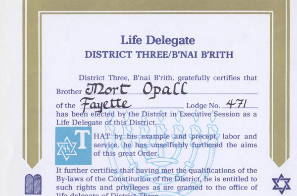 After years of work on behalf of the local B’nai B’rith chapter, Morton Opall was named a life delegate of the organization.