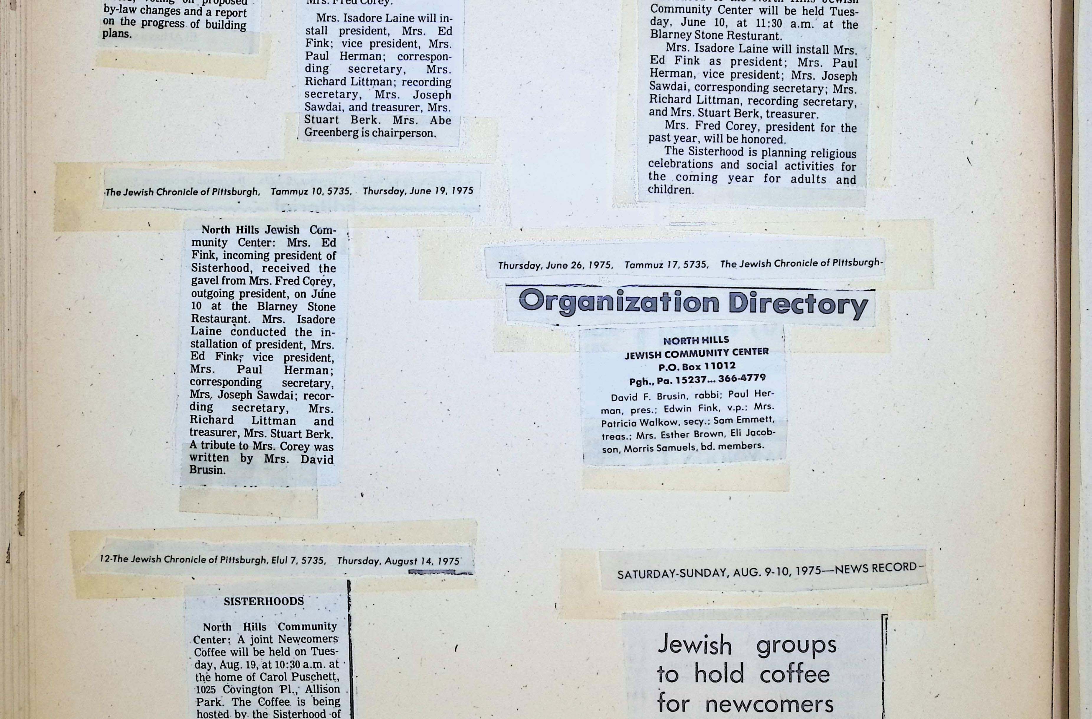 Assorted newspaper clippings announcing North Hills Jewish Community Center’s Sisterhood activities and events. Typescript, English, one page.