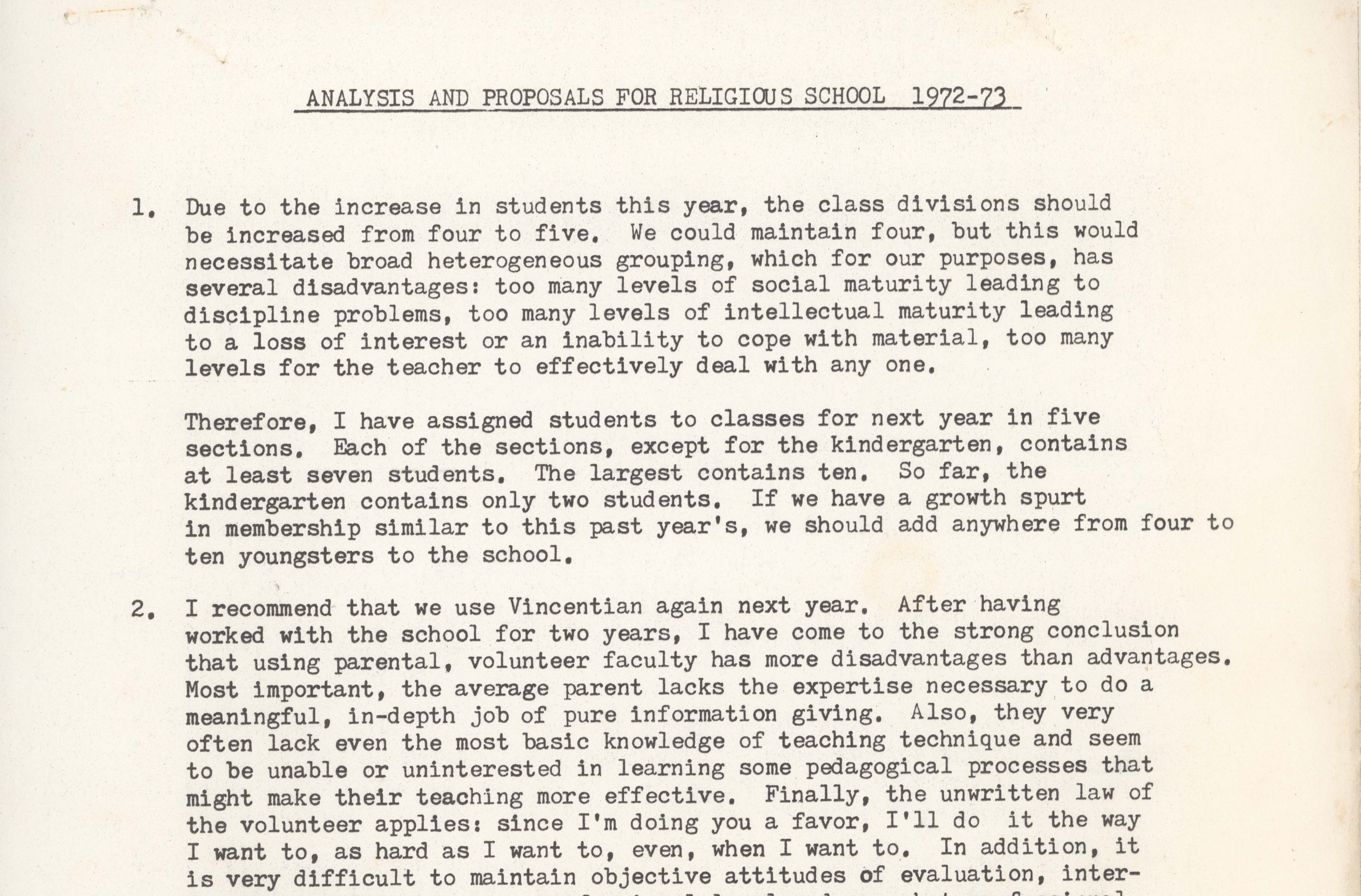 Analysis and proposal for the North Hills Jewish Community Center religious school. Document includes information on dues increase; use of Vincentian; hiring teachers; tentative curriculum. Typescript, English, four pages,