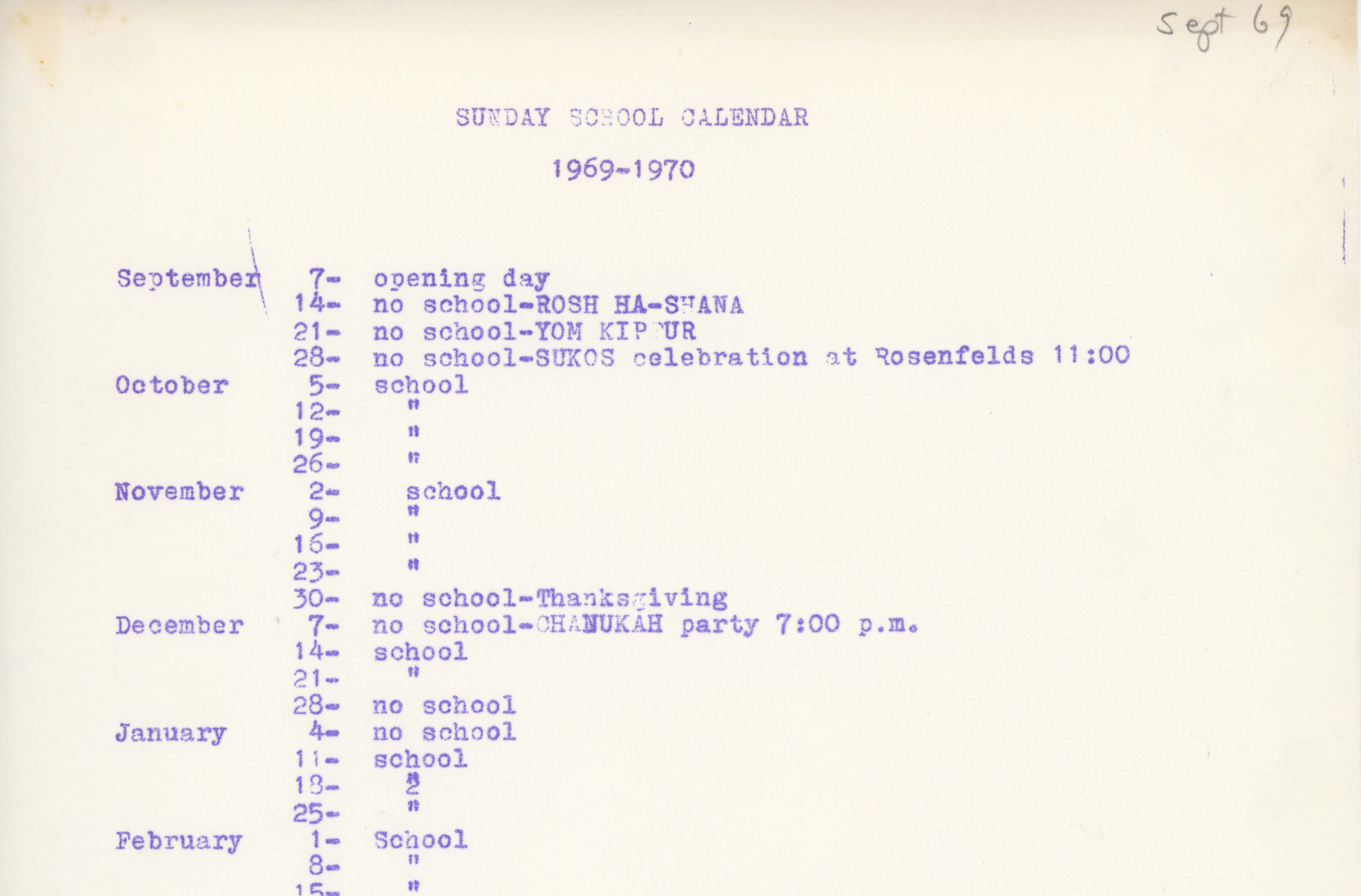 Sunday school calendar from the North Hills Jewish Community Center listing class dates between September 1969 and May 1970. Typescript, English, one page.