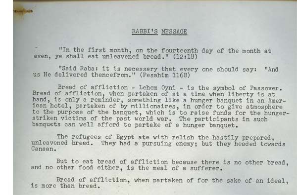 This bulletin from Ohav Sholom Congregation in Donora shows the Orthodox congregation preparing for Passover in traditional fashion, including the sale of leavened food and the completion of a tractate of the Talmud, which allows first-born sons to avoid a fast day immediately preceding the holiday.