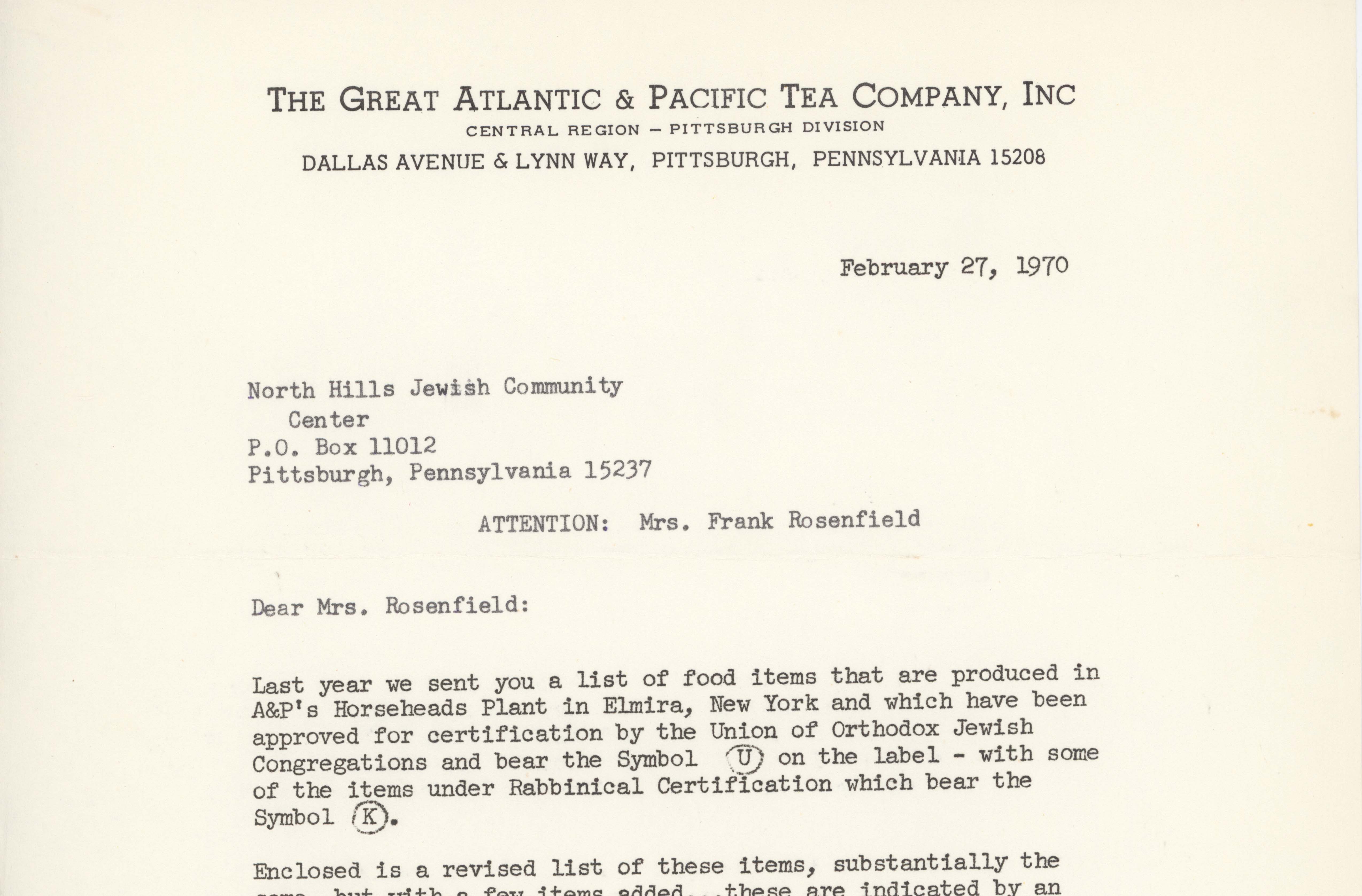 Letter from Paul Kyle, advertising manager of the Pittsburgh Division of the Great Atlantic & Pacific Tea Company, Inc., to Mrs. Rosenfeld. Kyle informs Mrs. Rosenfeld that the A&P has revised their kosher food list and that the Pittsburgh bakery has a new Jane Parker Enriched White Bread. Typescript, English, one page.