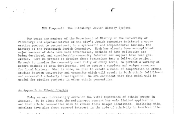 “NEH Proposal: The Pittsburgh Jewish History Project.” Proposal for National Endowment for the Humanities funding for the Pittsburgh Jewish History Project. Describes the purpose, goals, and background of the project. English, six pages.