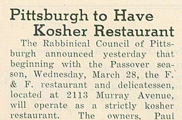 Unsigned article announcing that the Rabbinical Council of Pittsburgh provided kosher certification to F&F Delicatessen at 2113 Murray Ave. in Squirrel Hill.