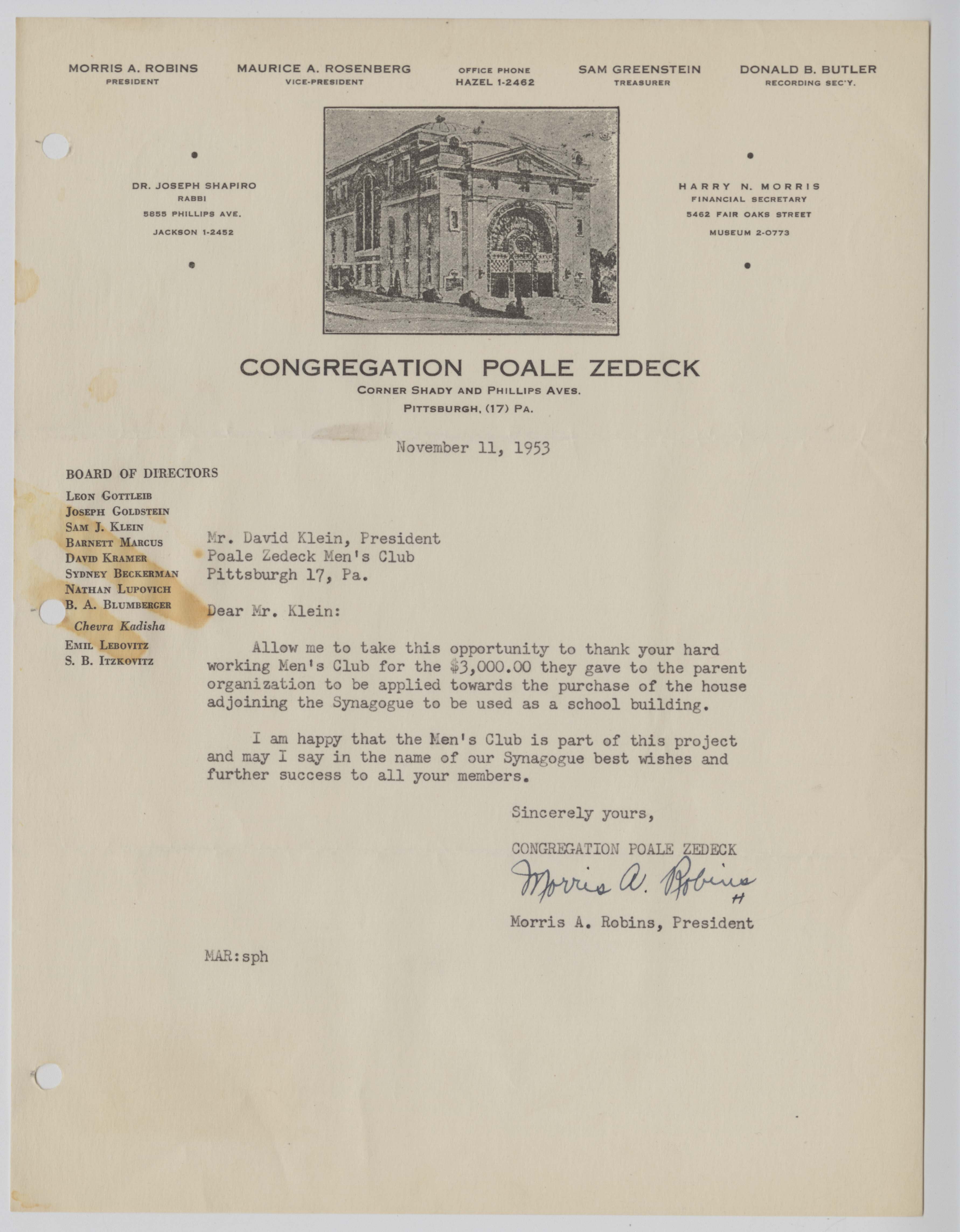 Letter from Congregation Poale Zedeck President Morris A. Robbins to Poale Zedeck Men’s Club President David Klein, acknowledging $3,000 donation toward education building.