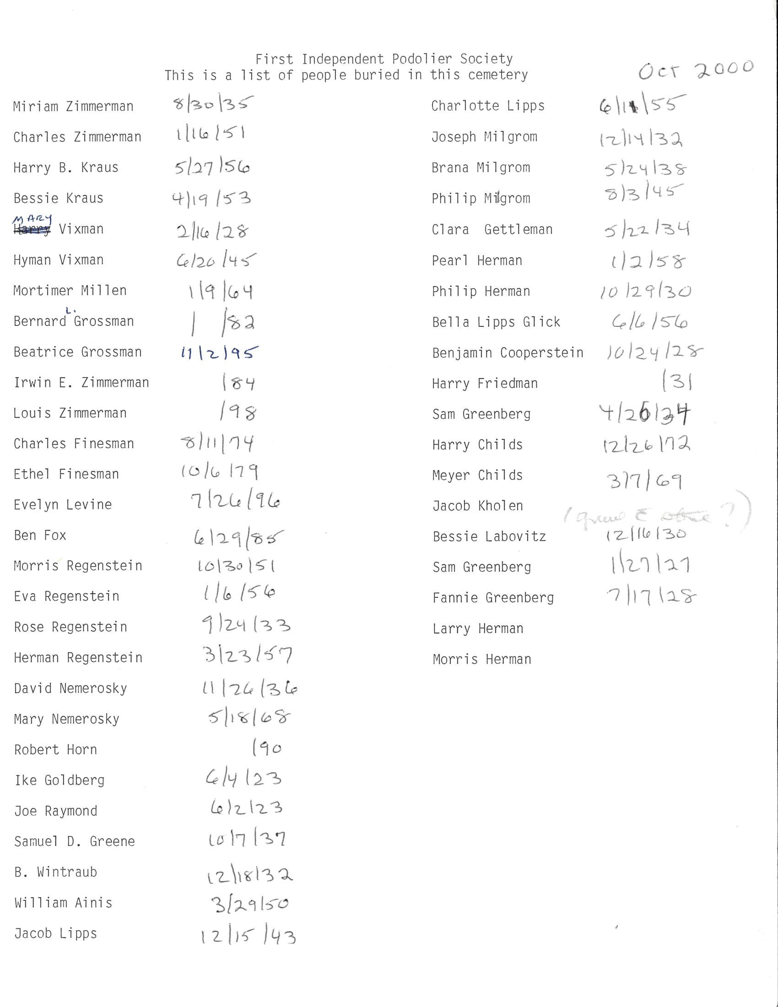 List of people buried in the First Podolier Independent Society cemetery. Includes burial dates. English, one page.