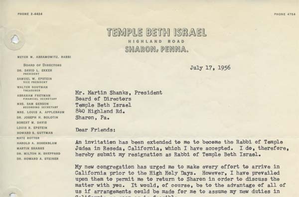 After eight years in Sharon, Rabbi Meyer Abramowitz left Temple Beth Israel to join a growing suburban congregation in the San Fernando Valley.