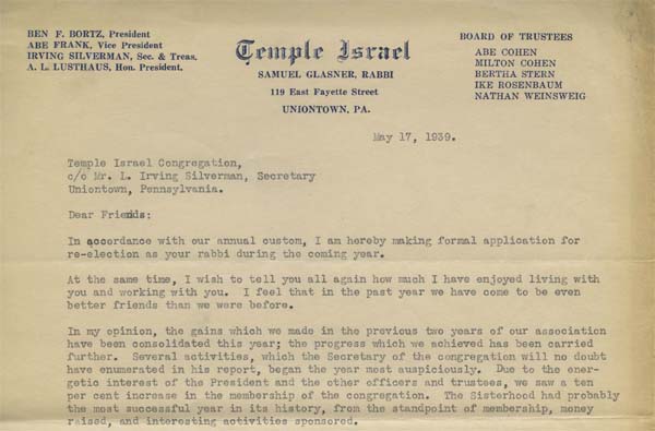 In his formal application for a contract renewal, Rabbi Samuel Glasner of Temple Israel in Uniontown noted the increasing membership and his growing renown and scolded the congregation for financial difficulties.