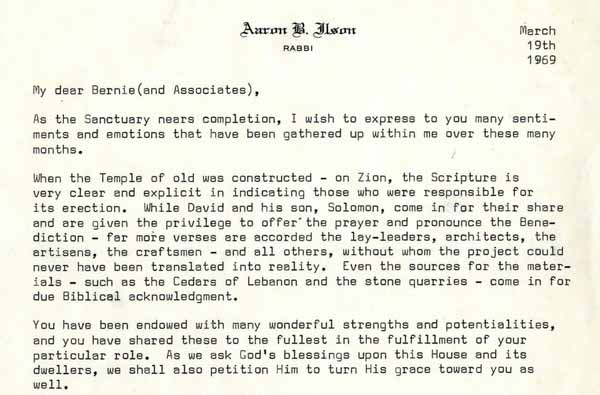 Rabbi Aaron Ilson of Temple Sinai in Squirrel Hill wrote Bernard Liff this letter of gratitude as an addition to the synagogue was nearing completion.