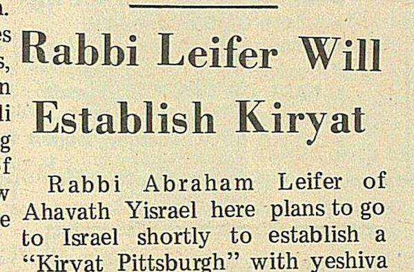 “Rabbi Lefier Will Establish Kiryat.” Unsigned article announcing Rabbi Abraham Leifer’s plans to relocate to Ashdod, Israel from Pittsburgh to establish a new community Kiryat Pittsburgh.