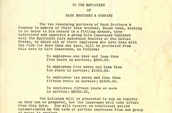 After the death of their brother Enoch, Marcus and Abraham Rauh created an insurance policy for their employees.