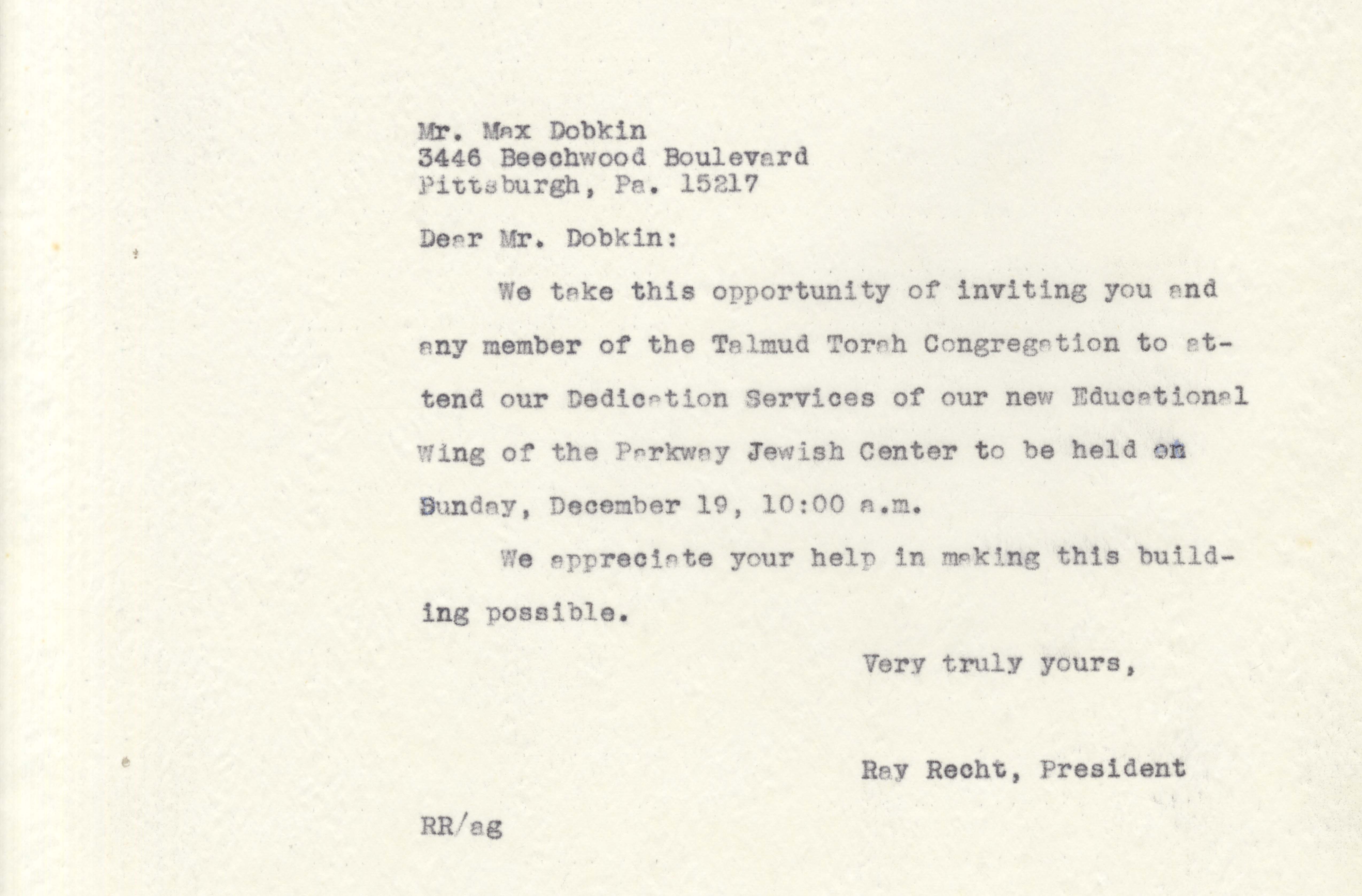 Letter from Ray Recht, president of Parkway Jewish Center, to Max Dobkin of Talmud Torah Congregation inviting the congregation to attend the dedication of PJC’s new educational wing. Typescript, English, one page.