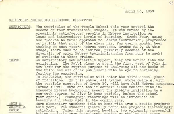 In the late 1950s, Rabbi Robert Bergman of Temple Beth Israel in Sharon launched a four-year effort to overhaul the religious school. The biggest change involved merging the Hebrew School and religious school. By the second year, younger classes had shown a marked improvement in Hebrew skills.
