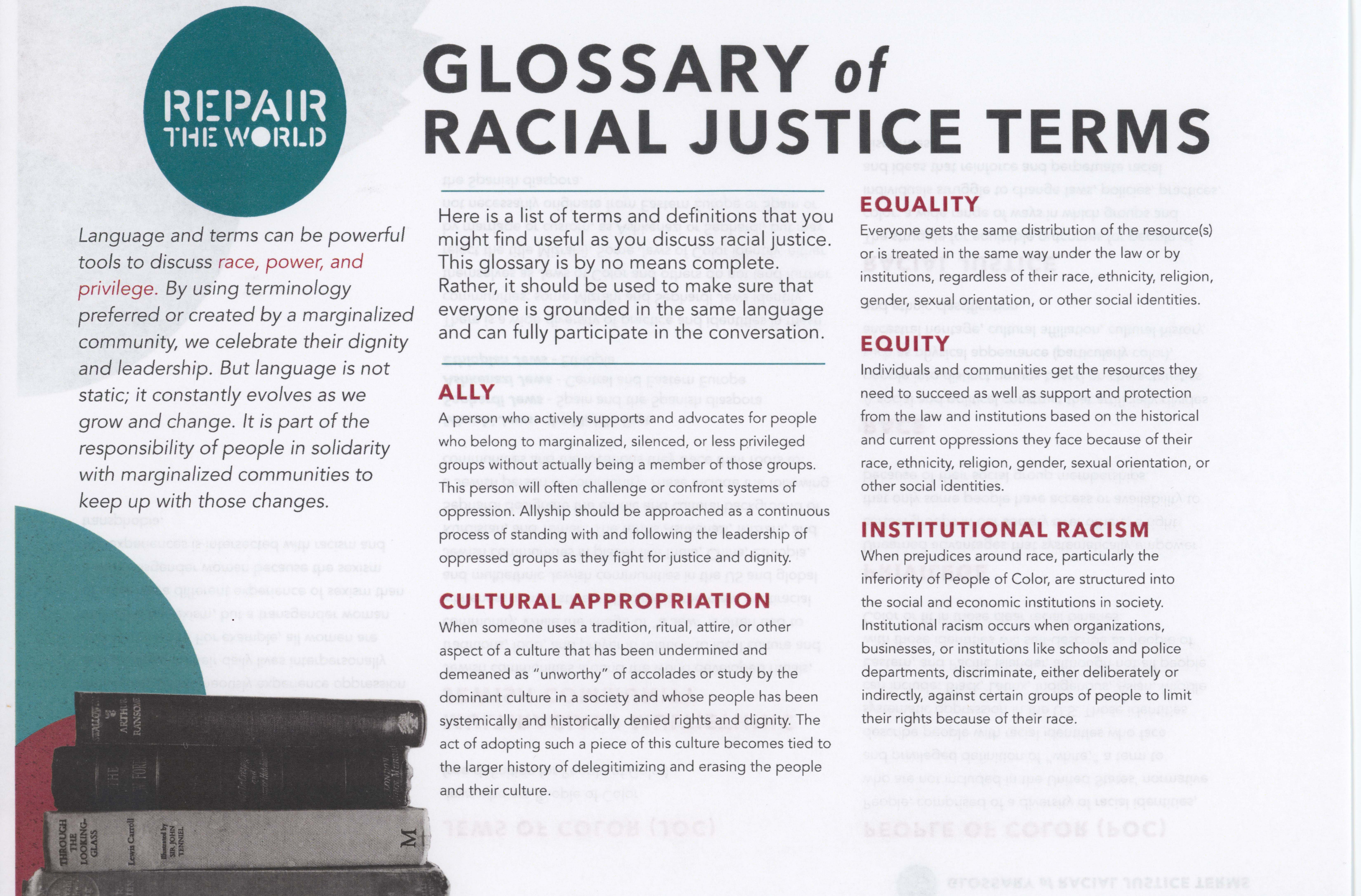 Glossary of racial justice terms from Repair the World Pittsburgh’s Martin Luther King day of service event. Typescript, English two pages.