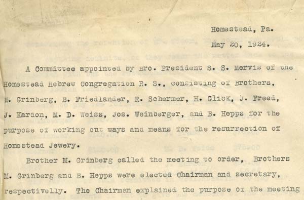 The board of Homestead Hebrew Congregation formed a special committee in 1924 to facilitate the “resurrection” of Judaism in the town.