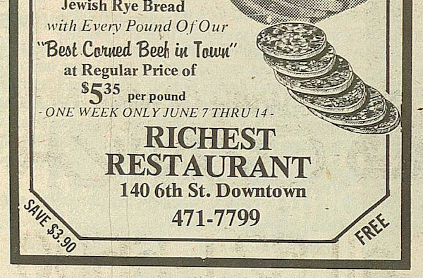 Advertisement for Richest Restaurant at 140 Sixth St. Lists anniversary special. Cuisine designed as “Jewish-style.”