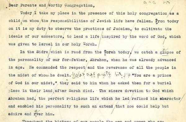 Robert Paul Lazar spoke about the Torah portion Chayei Sarah for his bar mitzvah. Date 1938 Identifier 20130111_B001_F00familydocs_speech Collection Lazar Family Papers and Photographs Source Rauh Jewish Archives at the Heinz History Center Family The Lazar Family : View Family Member View Document