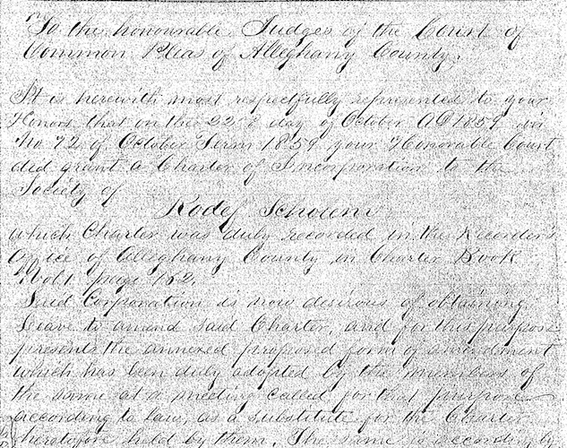 Reproduction of an 1865 amendment to the charter of Rodef Sholem Congregation, now spelled Rodef Shalom. Date October 7, 1865 Identifier ACCB_Vol1_P466-470_Rodef_Shalom Collection Allegheny County Charter Books (Vol. 1, Pages 466-470) View Document