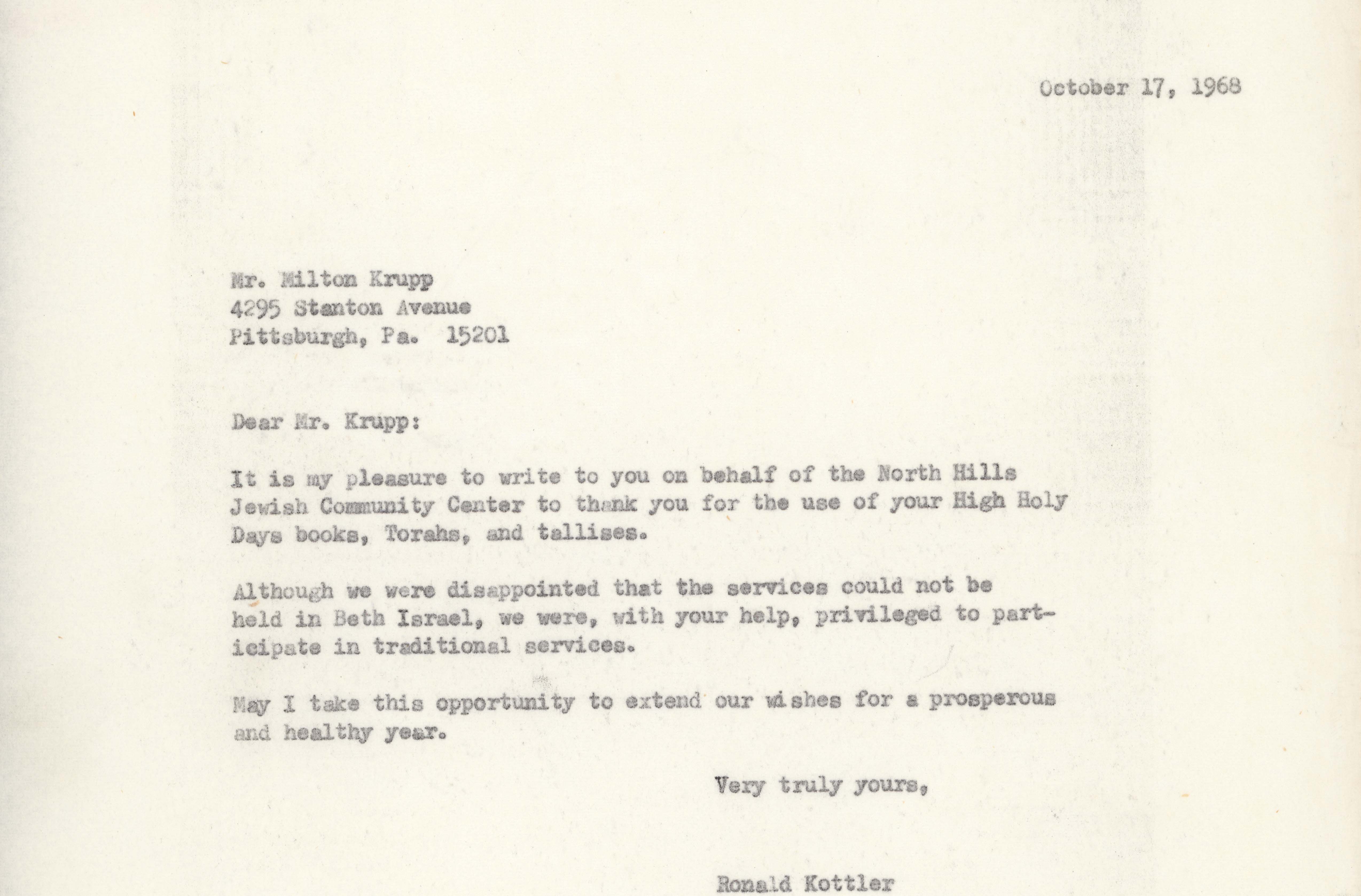 Letter from Ronal Kottler, president of the North Hills Jewish Community Center, to Milton Krupp thanking him for the use of his High Holy Days books, Torahs, and tallises. Kottler expresses his disappointment in not being able to hold services at Beth Israel. Typescript, English, one page.