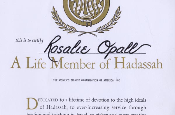 Rosalie Opall was involved with the Uniontown chapter of Hadassah for many year and was named a life delegate in 1976.