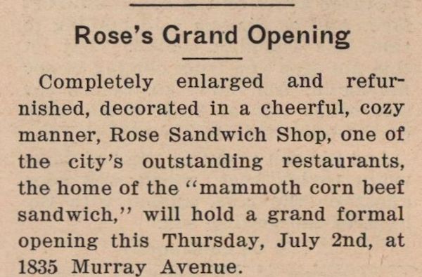 “Rose’s Grand Opening.” Editorial advertisment announcing re-opening of enlarged and redecorated Rose Sandwich shop at 1835 Murray Ave.