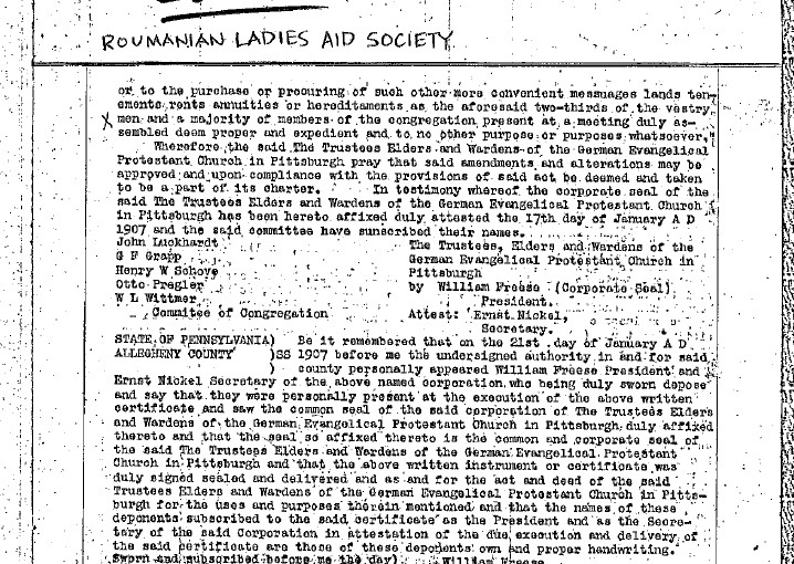 A reproduction of the Roumanian Ladies Aid Society charter. The chart states that the Society was created for the mutual relief of its members in case of sickness, disability or death and to aid in the case of the deserving sick and indigent and the burial of the worthy poor and unfortunate among the Jewish people of Allegheny County. Typescript, English, two pages.