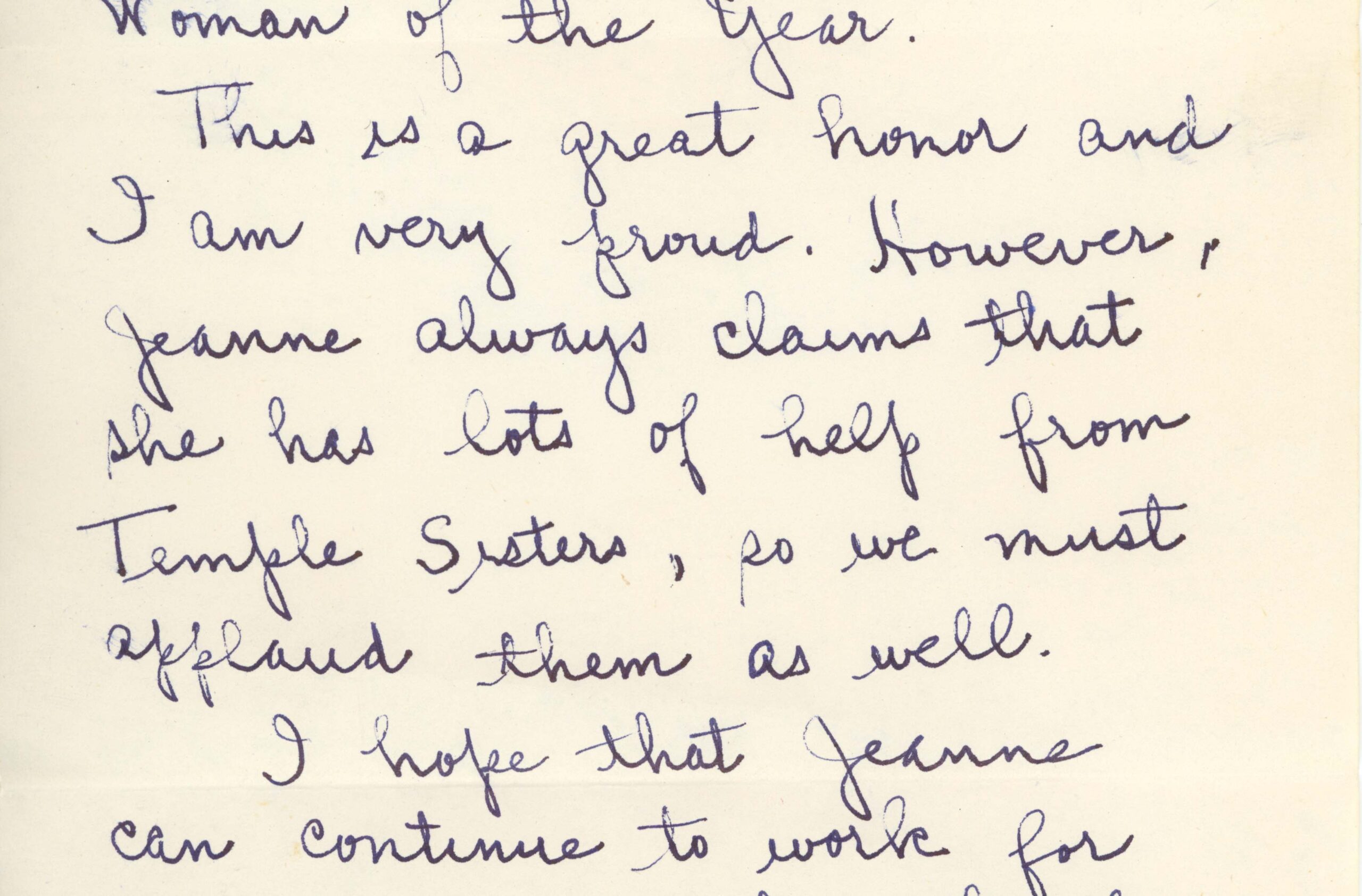 Letter from Ruth Fischman to the Temple Emanu-el Sisterhood thanking the group for choosing her daughter Jeanne Schimmel as “Women of the Year.” Fischman shares how proud she is of Jeanne and congratulates her. Handwritten, English, two pages.