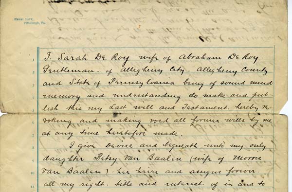 Sarah DeRoy, born Saartje Israel van Baalen, updated her last will and testament in 1890. Date April 7, 1890 Identifier Sarah_DeRoy_Last_Will_and_Testament Collection Patricia K. and Ralph L. DeRoy Papers and Photographs (MSS 1200) Source Rauh Jewish Archives at the Heinz History Center Family The DeRoy Family : View Family Member View Document