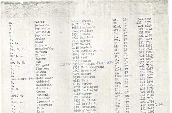 Membership list for Shaaray Tefilah Congregation, compiled sometime following its relocation to Squirrel Hill in the late 1940s.