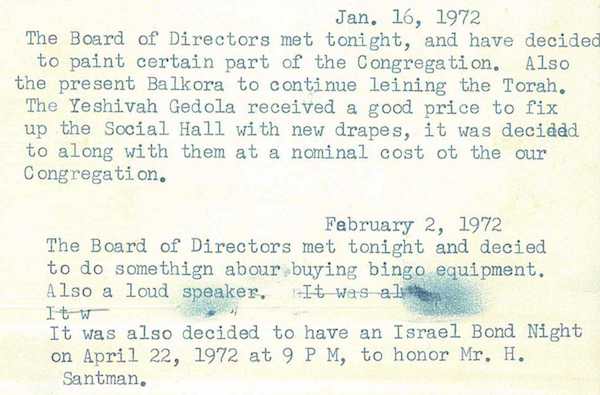 Shaaray Tefilah Congregation board of directors minutes (1972), 11 pages, typescript.