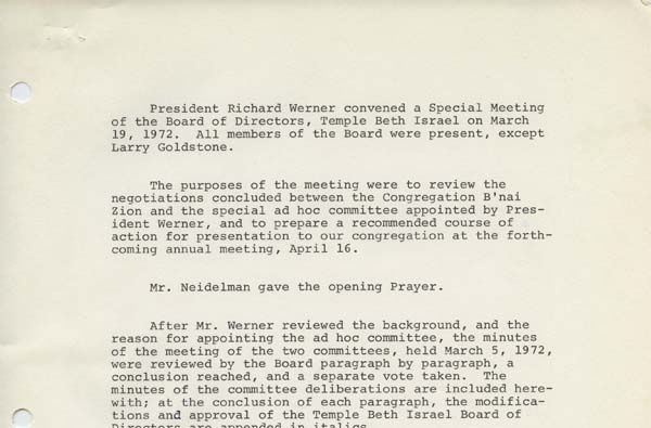 With membership declining, Congregation B’nai Zion in Farrell and Temple Beth Israel in Sharon negotiated a merger in 1972. These minutes from a special board meeting show what issues the two congregations discussed as they considered a merger, including the hiring of an Orthodox cantor for High Holiday services.