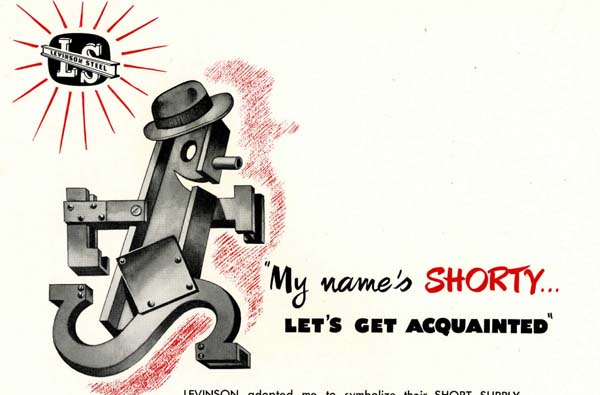Levinson Steel used the Shorty character as an icon. Date 1951 Identifier 20030076_B001_black_album_my_name_shorty.pdf Collection Levinson Steel Company Collection Source Rauh Jewish Archives at the Heinz History Center Family The Levinson Family : View Family Member View Document