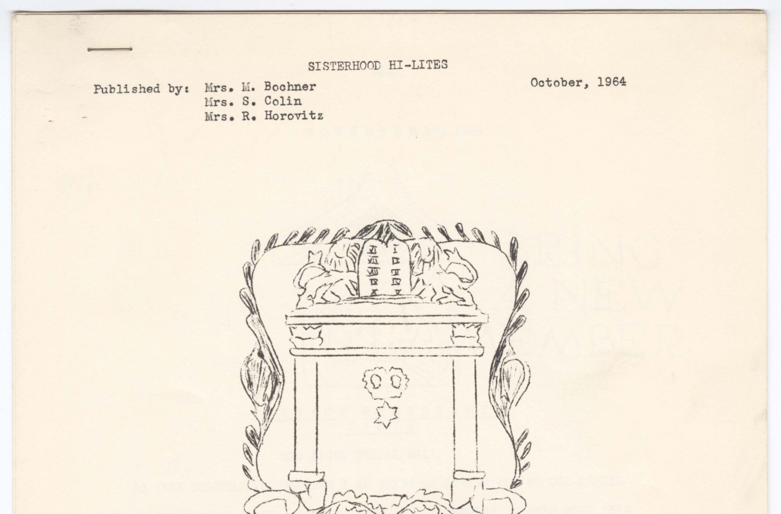 New Light Sisterhood newsletter. Includes a drawing of an alter and Torah scroll; includes an excerpt from Sam Levenson; lists details for the Paid-Up Membership Party. Typescript, English, two pages.