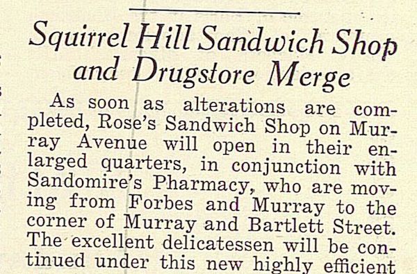 “Squirrel Hill Sandwich Shop and Drugstore Merge” Editorial advertisment announcing merger of Rose Sandwich Shop and Sandomire’s Pharmacy.