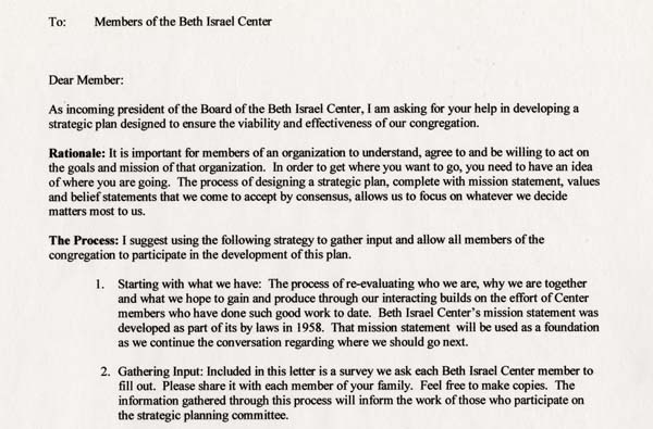 In 2001, Beth Israel Center launched a strategic planning process to guide its operations in the face of declining membership and increasing expenses.