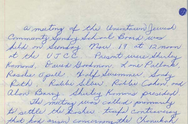 During the first school year of the newly merged Uniontown Jewish Community Sunday School, someone brought a non-kosher chicken dish to a Chanukah party. The board of the religious school convened a meeting after the incident to review the food policy of the school. The matter highlighted the challenges involved in merging the religious schools of two congregations.