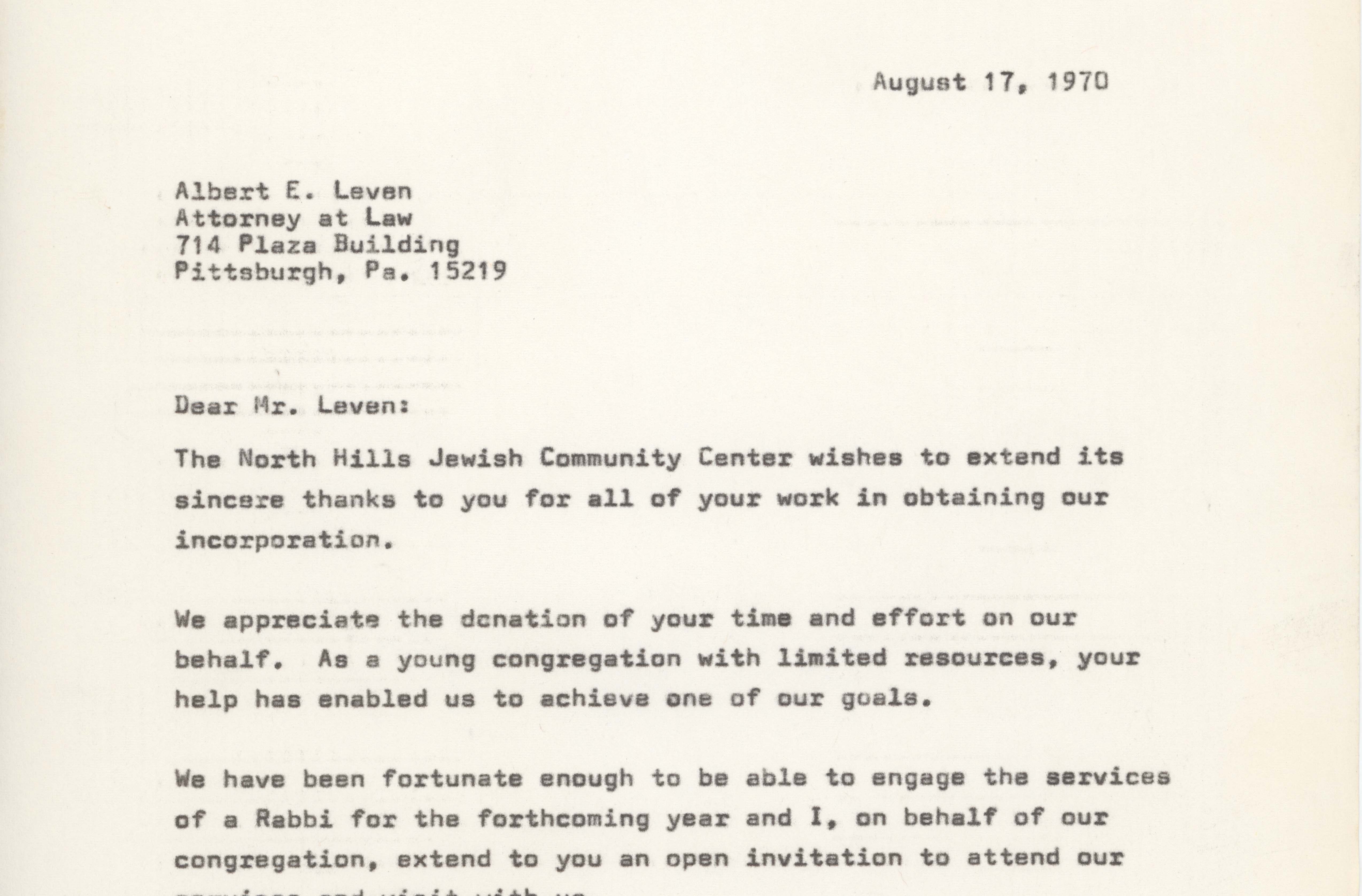 Letter from Ted Barnett, president of the North Hills Jewish Community Center, to attorney Albert Levan thanking him for helping the congregation obtain their incorporation. Typescript, English, one page.