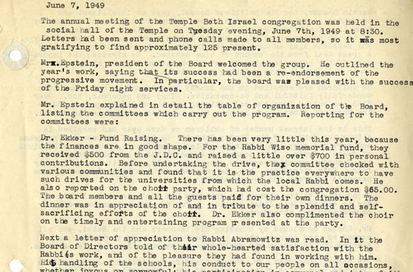 At the 1949 annual meeting of Temple Beth Israel in Sharon, the congregation discussed plans to use the Union Prayer Book for the upcoming High Holidays services while making accommodations for those who preferred a traditional service. The congregation had 160 members at the time.