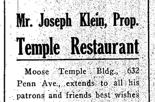 Advertisement for the Temple Restaurant at 632 Penn Ave. downtown. Includes High Holiday greeting. Proprietor, Joseph Klein.