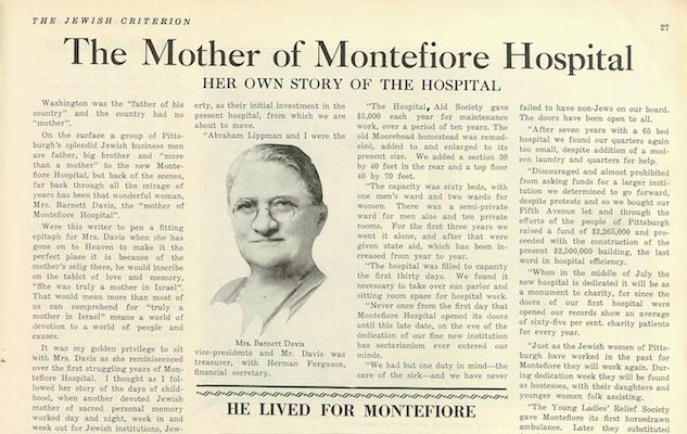 Jewish Criterion profile of Annie Jacobs Davis by Dr. S. M. Melamed written before the dedication of the second Montefiore Hospital.
