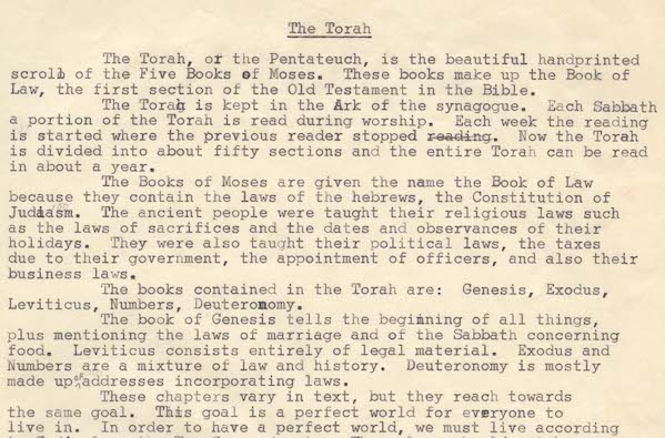 “The Torah.” Address deliver by Ellen Lehman as part of the confirmation service of the Pittsburgh School for Reform Judaism.