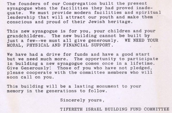 The Building Fund Committee of Tifereth Israel sent this appeal to members as they prepared to build a new synagogue on the North Hill of New Castle. The committee said that the new building would “attract our youth and make them conscious and proud of their Jewish heritage.”